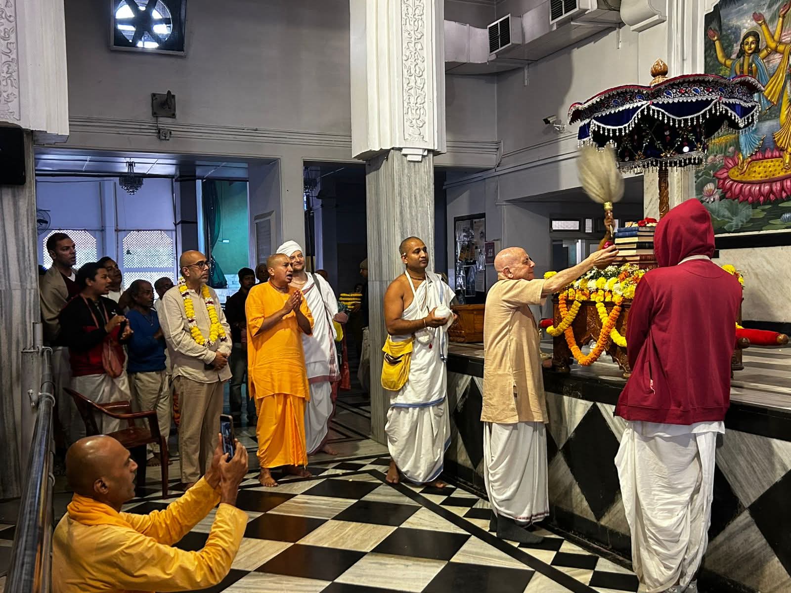 The morning continued with a heartfelt ārati offered by HG Rameshwar Prabhu, followed by a moving procession to Śrīla Prabhupāda’s room in the Lotus Building, where restored books were formally installed. As devotees walked together in kīrtana, many felt a deep, personal connection.